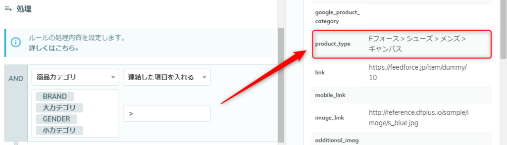 元の商品データに「大カテゴリ(シューズ)」と「小カテゴリ(キャンバス)」があり、これらと「ブランド」「対象性別」を組み合わせてみます。区切り文字には「 > 」を指定します。