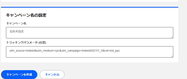ただし、広告枠からのCVを分けて計測したい場合はIndeed管理画面からキャンペーン単位でURLパラメータを上書きする必要があります。